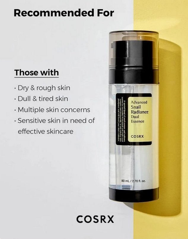 تحويل روتين العناية بالبشرة الخاص بك مع COSRX Advanced Snail Radiance Essence Dual Essence. يجمع هذا المنتج المبتكر بين قوة مرشح الحلزون والنياسيناميد في صيغة مزدوجة الحركة توفر فوائد فورية ودائمة. يمتص الجوهر الخفيف والترطيب بسرعة ، مما يوفر بشرتك طفرة من الرطوبة والإحساس المنعش. في هذه الأثناء ، يغذي الجوهر الكريمي الجلد ، ويعزز توهجه الطبيعي وإشراقه. مع إفراز الحلزون الغني المليء بالبروتينات والأحماض الجليكوليك والإيلاستين ، لا ينعش هذا الجوهر فقط بشرتك ولكنه يساعد أيضًا على تقليل رؤية الخطوط الدقيقة والتجاعيد. مناسبة لجميع أنواع البشرة ، هذا الجوهر المزدوج هو الحل الخاص بك لتحقيق بشرة مشعة وشبابية بشكل واضح.