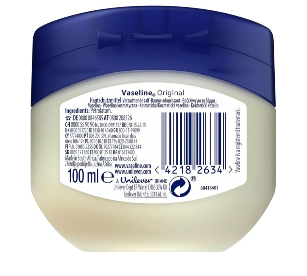 فازلين بتروليوم جيلي الأصلي 100% مرطب طبيعي لعلاج الجفاف. استخدميه يوميًا على جسمكِ بالكامل، حتى وجهكِ.