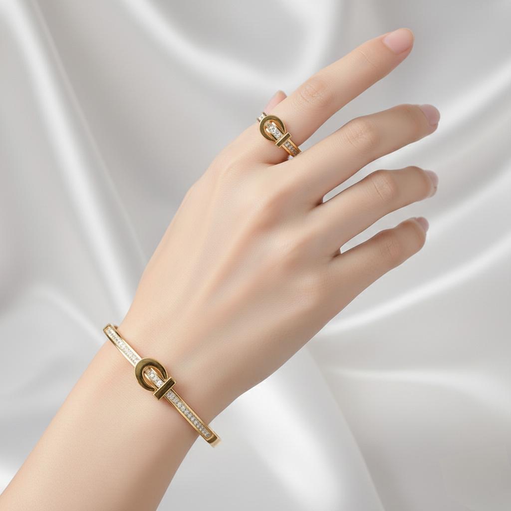 Material: 18K gold-plated stainless steel bracelet and ring, adorned with cubic zirconia stones.